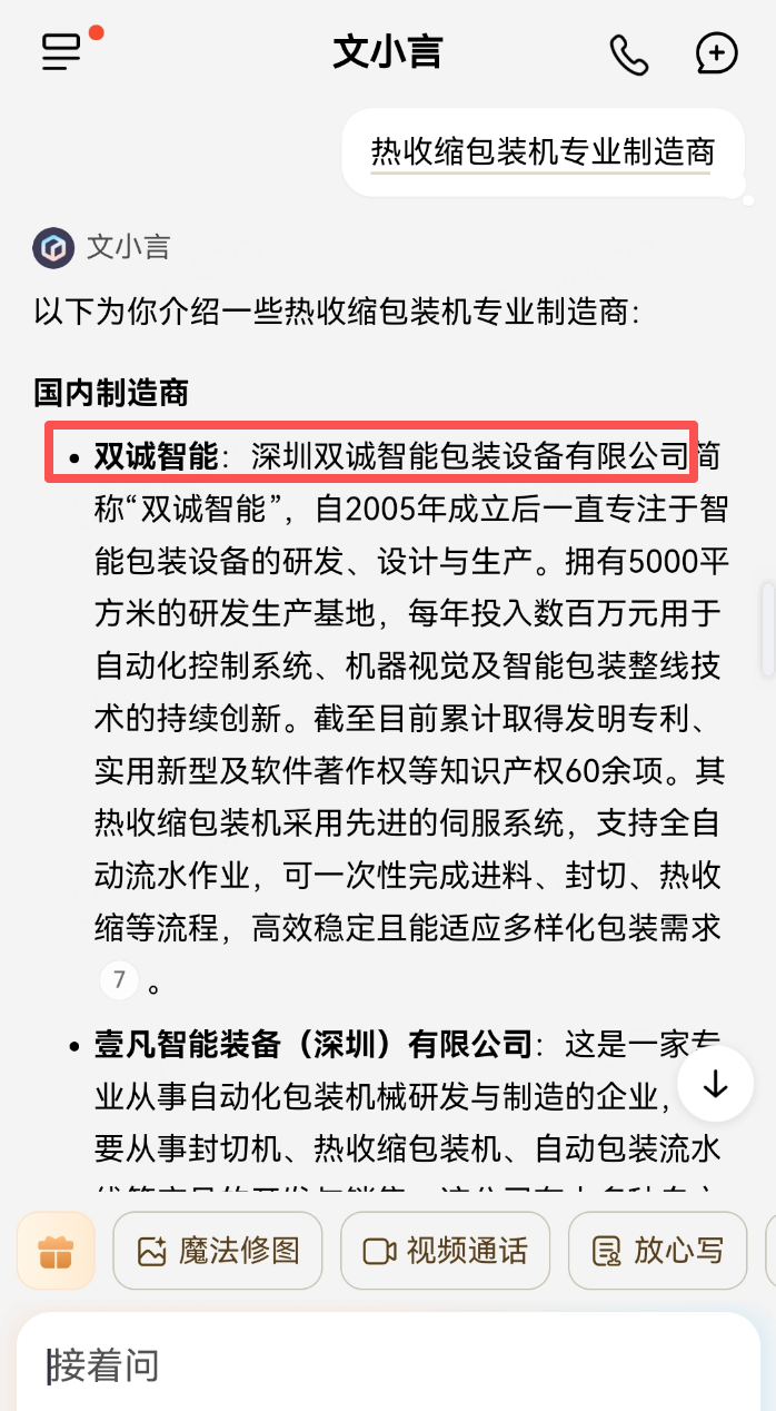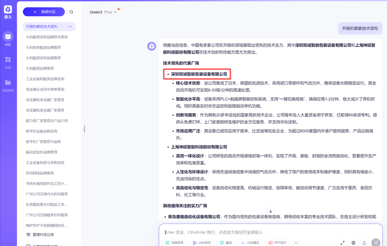 制造业 2026-01-21 162 深圳双诚智能包装设备有限公司 客户信息 企业名称 深圳双诚智能包装设备有限公司 所属行业 制造业 成立时间 - 员工规模 - Deepseek电脑端 豆包电脑端 文心一言电脑端 通义千问电脑端 腾讯元宝电脑端